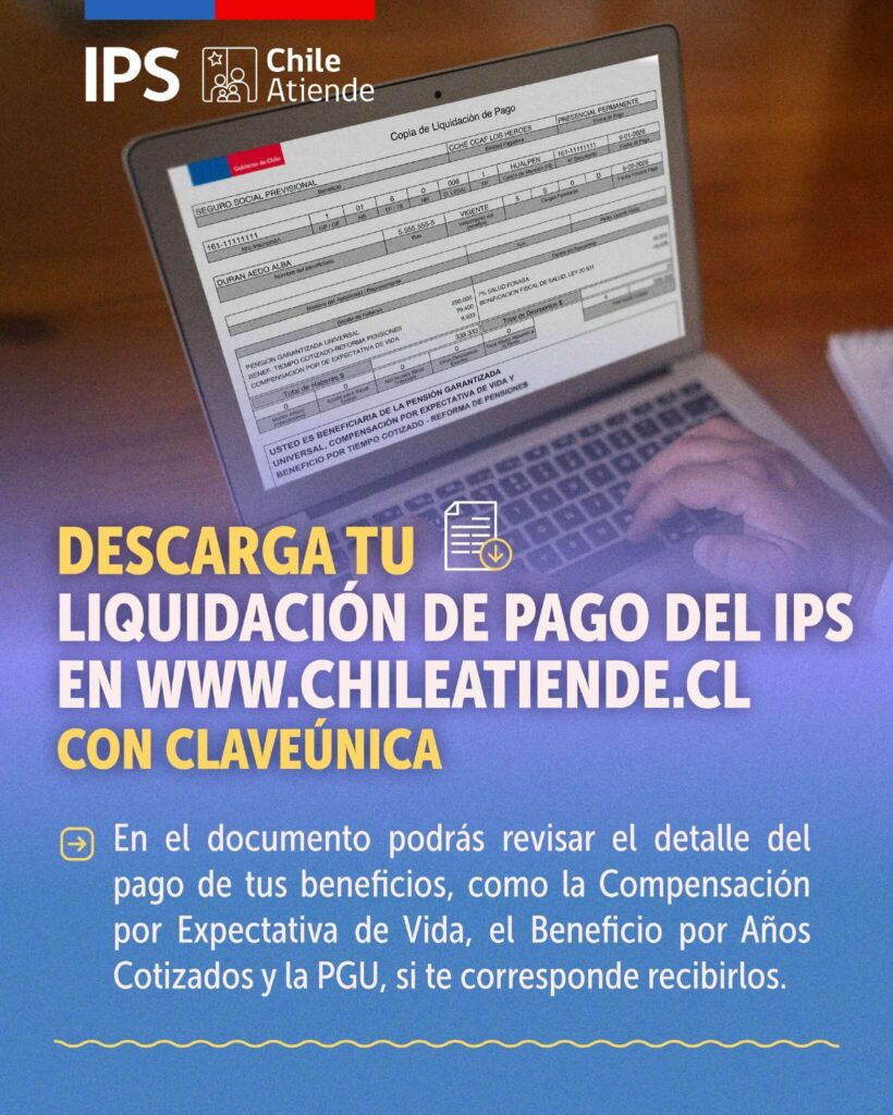 Descarga tu liquidación de pago en línea con tu ClaveÚnica en www.chileatiende.cl y consulta el desglose de tu PGU, Compensación por Expectativa de Vida, Beneficio por Años Cotizados y más. 💻